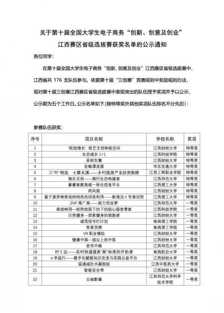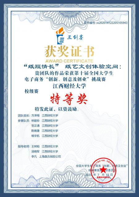 近日,第十届全国大学生电子商务“创新、创意及创业”挑战赛江西赛区省级选拔赛在我校隆重举行。在经过激烈的角逐后,威尼斯人娱乐场 《“纸短情长”纸艺文创体验空间》项目荣获校级特等奖第一名(冠军)、省级特等奖第一名(冠军)晋级国赛。