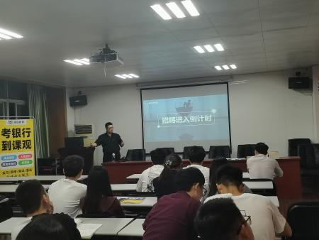 会议开始前,课观教育负责人为大家发放银行招聘考试的相关资料,而后樊磊从行业的角度介绍了银行的概况,人才策略及发展前景,同时对应聘者的具体要求和发展通道进行了简单的介绍,并结合许多学员经历跟学生们分享了成功的经验和心得,促进与同学们心灵的沟通与交流,并激励大家积极择业,做正确的人生选择。