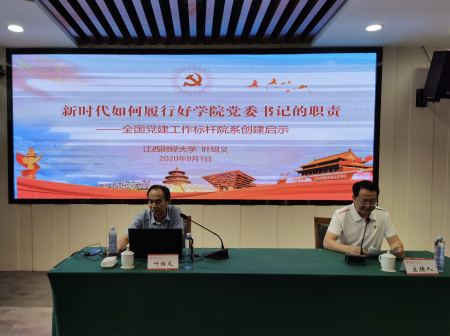 9月2日下午,江西财经大学学工部部长、学工处处长叶绍义同志应邀到方志敏干部学院,为东华理工大学党群部门处级干部、各学院党委书记、各学院党委副书记等党务工作者作党建报告。