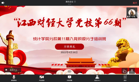 4月16日上午,江西财经大学党校第66期暨统计学院分党校第11期入党积极分子培训班开班典礼于线上正式举行,统计学院党委书记陶春海、党委副书记黄黑平以及227名入党积极分子参加此次开班典礼。