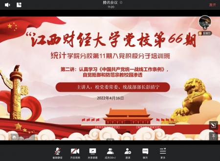 4月16日下午,统计学院通过腾讯会议第11期入党积极分子培训班第二讲党课开讲,校党委常委、统战部部长彭清宁为全体学员作题为“认真学习《中国共产党统一战线工作条例》、自觉抵御和防范宗教校园渗透”的辅导报告。
