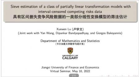 511日上午,应统计学院邀请,卡尔加里大学卢学文教授为统计学院师生带来一场题为“Sieve estimation of a class of partially linear transformation models with interval-censored competing risks data”的线上讲座。本次讲座由统计学院副院长刘小惠主持,统计学院部分教师和研究生参加。