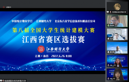 2022年第八届全国大学生统计建模大赛江西分赛区答辩赛于6月26日线上进行,由江西财经大学统计学院承办。此比赛于3月 8日正式启动,吸引力了来自江西省的14所高校同学的积极参与。经历对于作品的评审后,按比例选取本科生组19支队伍与研究生组16支队伍同时进行线上答辩。经历一个上午的答辩环节,选出9支本科生组与8支研究生组晋级国赛,与全国各支队伍进行比赛。