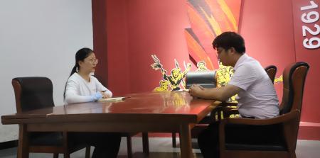 图为江西财经大学统计学院学子在九龙山革命斗争陈列馆对九龙山乡干部曾锋进行采访。