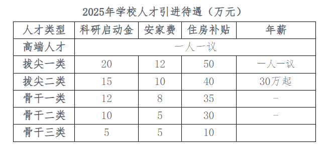 2.骨干人才按学校审核聘任的专业技术岗位享受校内同类人员薪资。高端、拔尖人才原则上为年薪制人才,对应有聘期考核任务。