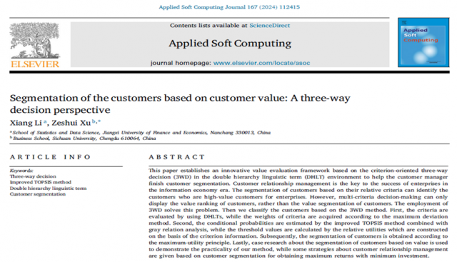 近日,在线娱乐场 学院李翔老师与四川大学徐泽水教授合作的研究论文《Segmentation of the customers based on customer value:A three-way decision perspective》在计算机科学国际一流期刊Applied Soft Computing 2024年第167卷正式发刊。