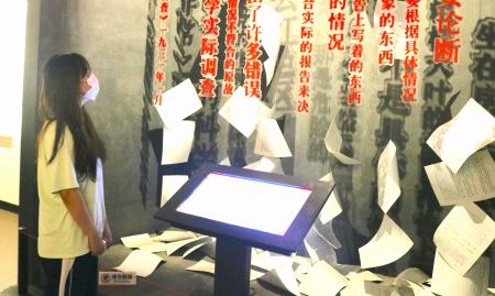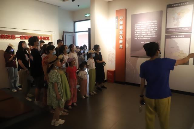 图为江西财经大学统计学院学子们在兴国调查陈列室听讲解员介绍历史故事。